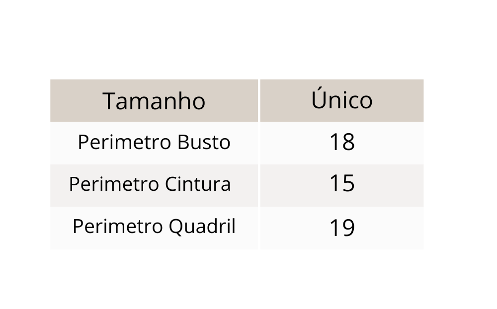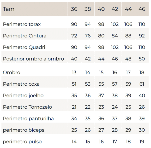 | Perim. Quadril | 90cm | 94cm | 98cm | 102cm | 106cm | 110cm |