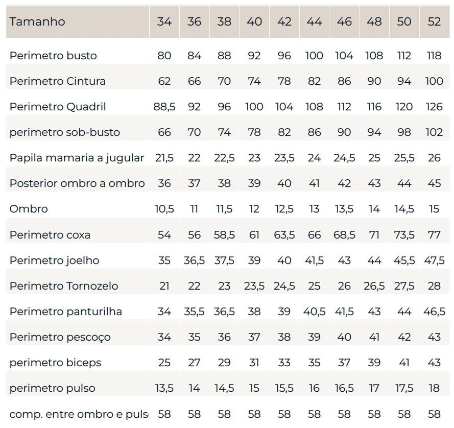 | Tamanho | 34 | 36 | 38 | 40 |