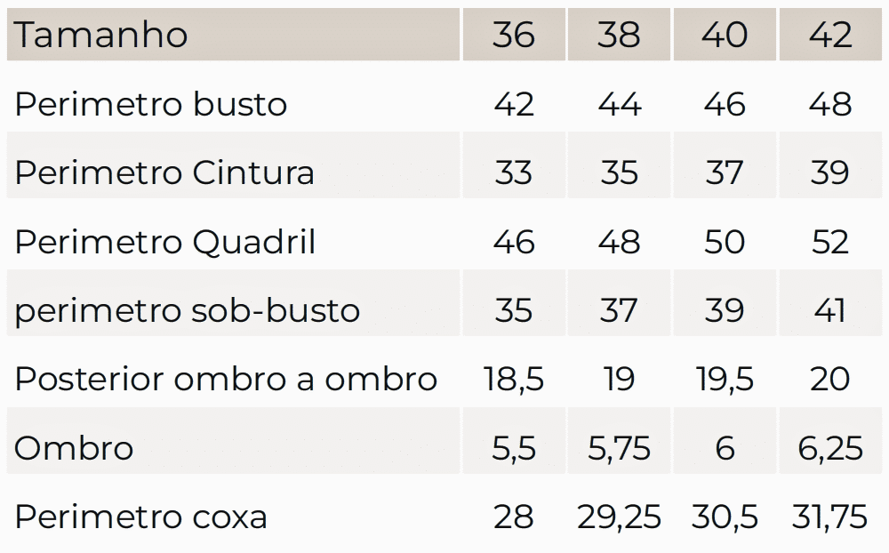 | Tamanho | 36 | 38 | 40 | 42 | 44 | 46 |
