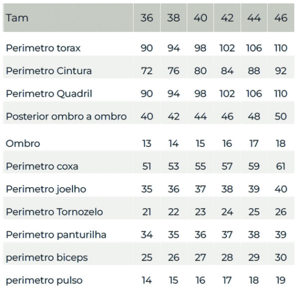 | Perim. Panturilha | 34cm | 35,5cm | 36,5cm | 38cm | 39cm | 40,5cm | 41,5cm | 43cm | 44cm | 46,5cm |
