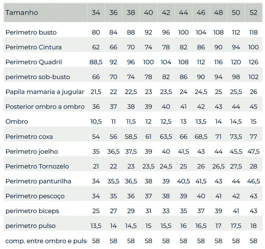 | Tamanho | 34 | 36 | 38 | 40 | 42 | 44 | 46 | 48 | 50 | 52 |