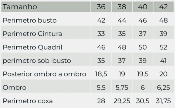 | Perim. Sob Busto | 66cm | 70cm | 74cm | 78cm | 82cm | 86cm | 90cm | 94cm | 98cm | 100cm |